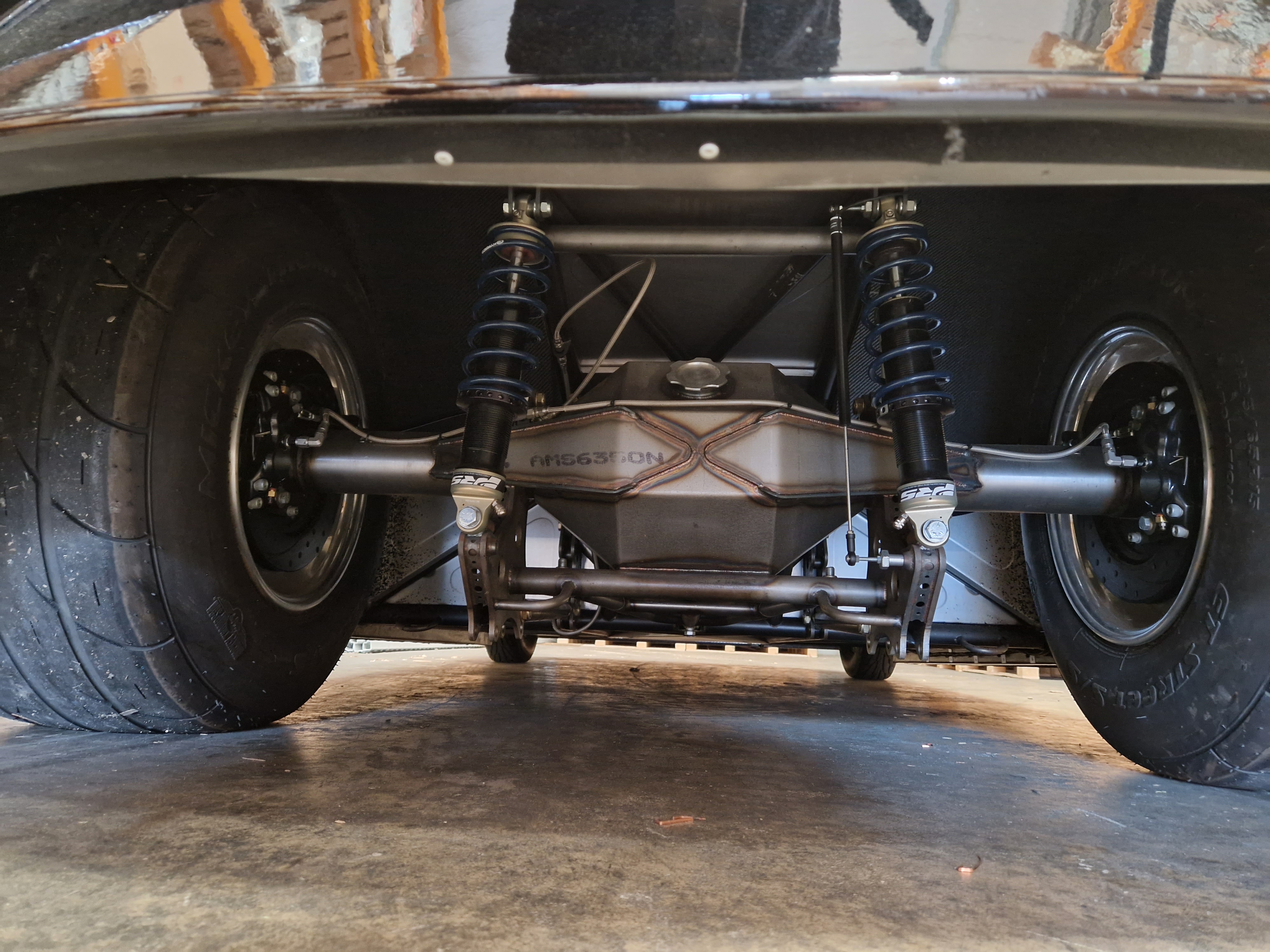 The gearbox couples directly to a reinforced prop shaft feeding into a Ford 9" rear differential. Connected via 4-link suspension for optimal traction, paired with massive 10x15" wheels wrapped in 275/50R15 Mickey Thompsons for maximum grip off the line.